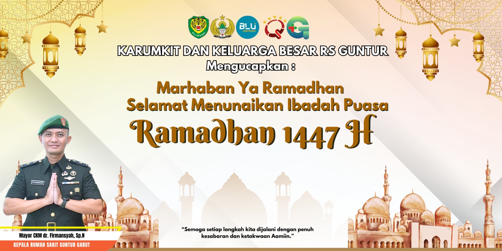 Dalam rangka menyambut datangnya bulan suci Ramadhan 1447 Hijriah, Kepala Rumah Sakit Guntur, Mayor Ckm dr. Firmansyah, Sp.N, menyampaikan ucapan selamat menunaikan ibadah puasa kepada seluruh prajurit, PNS, keluarga besar TNI, tenaga kesehatan, serta masyarakat yang menjalankan ibadah Ramadhan.